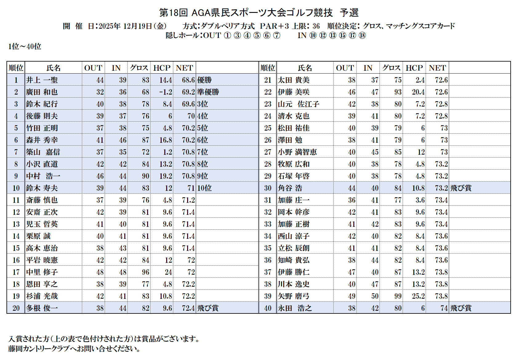 第18回AGA県民スポーツ大会ゴルフ競技予選 1位ー40位